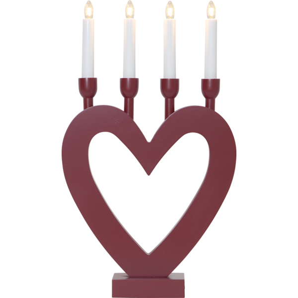 Röd träljusstake med formen av ett hjärta, 4 ljus. Placera i fönstret eller på en skänk till advent.