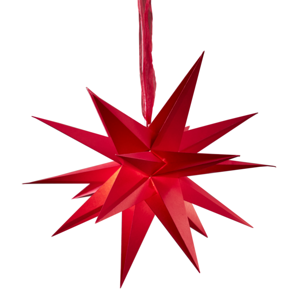 Röd tredimensionell pappersstjärna med 18 st uddar och ett vackert dekorationsband. En fantastisk dekoration över bordet, häng dem en eller flera tillsammans. En stjärna som kan lysa upp under vinterns alla månader inklusive novent, december och självaste julafton. Monteras enkelt ihop med hjälp av dragskon och dekorationsbandet. Lägg till sladdställ och ljuskälla för belysning i stjärnan. Stjärnan är 43 centimeter.