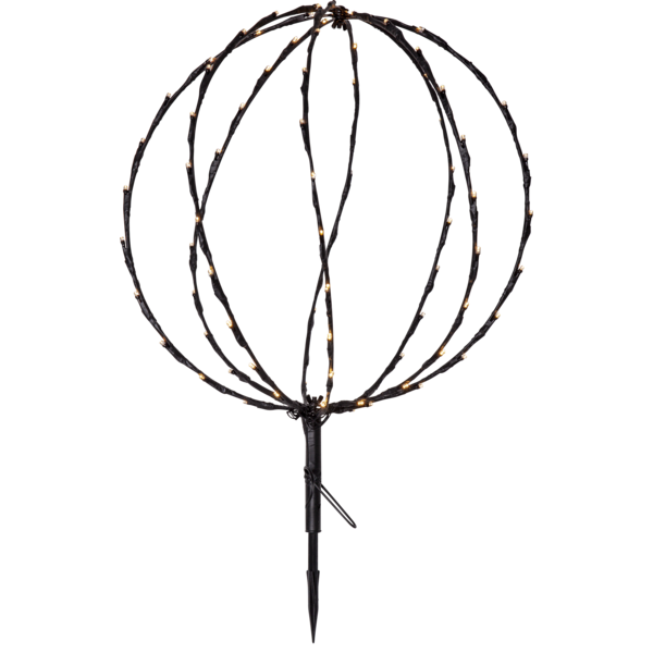 Dekorativt svart klot med 88 varmvita ljuspunkter, 40cm i diameter. Ger ett härligt ljus till din trädgård. Produkten kan användas som både hängande och stående, markspettet är avtagbart och det finns en krok för upphäng, för att inte belasta kabeln använd en kedja eller rep att hänga klotet i. Batteribox för utomhusbruk. Klotet är ihopvikbart vilket sparar utrymme när den inte används.